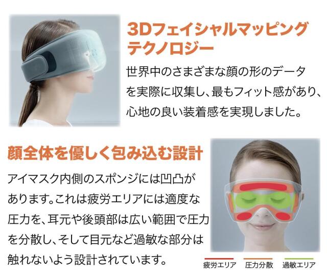 アイマスク内側のスポンジには凹凸があります。これは疲労エリアには適度な圧力を、耳元や後頭部は広い範囲で圧力を分散し、そして目元など過敏な部分は 触れないよう設計されています。