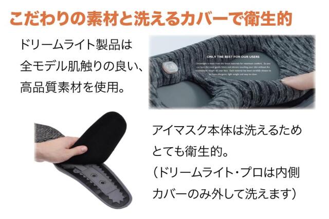 アイマスク本体は洗えるため とても衛生的。 (ドリームライト・プロは内側 カバーのみ外して洗えます)