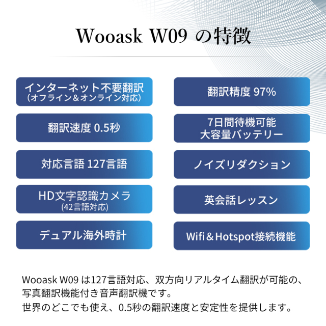 TOPALL 全商品ライナップ 翻訳機 Wooask W09 ウーアスク イヤホン 携帯翻訳機 127言語対応 0.5秒翻訳 写真翻訳 オフライン翻訳 HDタッチスクリーン Wifi ホットスポット ビジネス 出張 語学学習 Bluetooth 5.0対応 完全ワイヤレスイヤホン 4G 5G WiFi 7日間使用可 ブラック 価格: ¥21,800 (税込) [ポイント還元 218ポイント~] 販売期間: 数量: 個 在庫: ○ 在庫 ○ 返金保証について詳しくはこちら