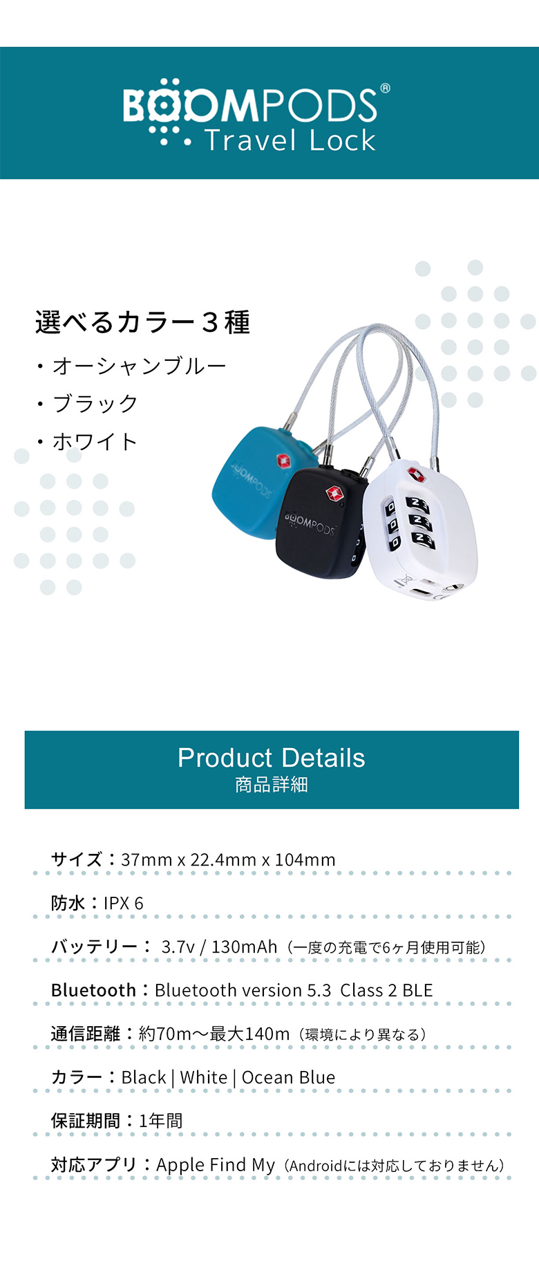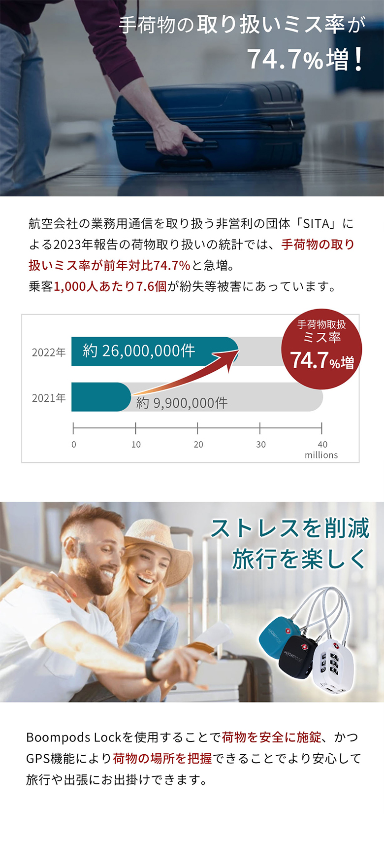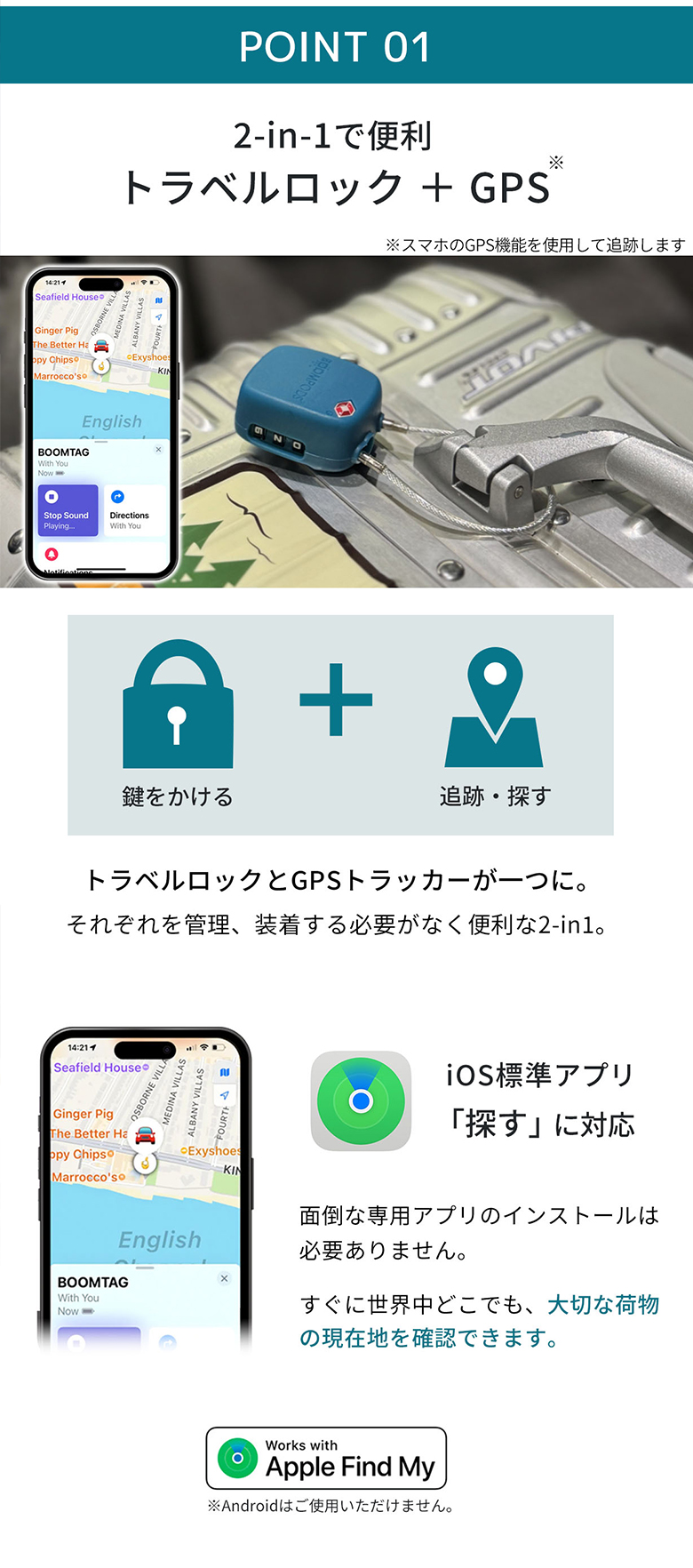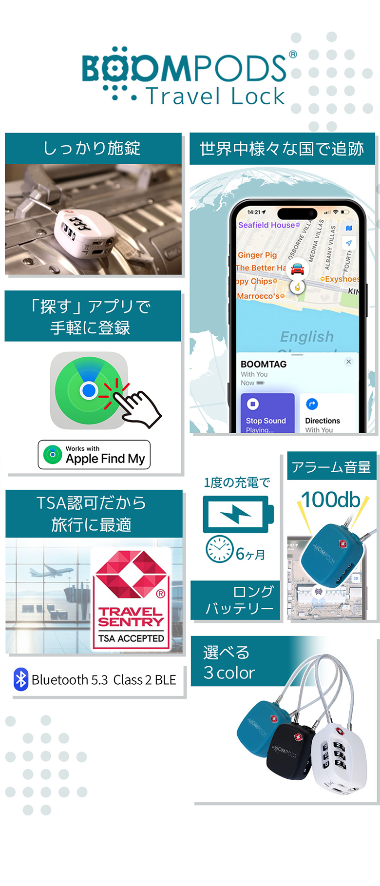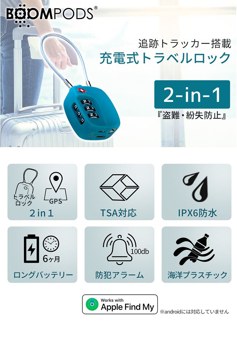 追跡トラッカー&トラベルロック 充電式 Boompods 2-in-1 TSA認可 盗難・紛失防止に GPS 旅行 出張 貴重品 自転車 楽器 防水 防犯アラーム 南京錠